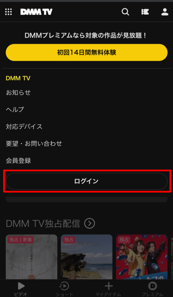 DMM TV公式サイトへアクセス後、画面右上の人型アイコンを選択して「ログイン」を選択します。