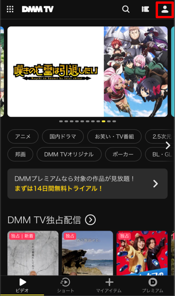2. 右上の「人型アイコン」から 「DMMプレミアム」設定ページ へ